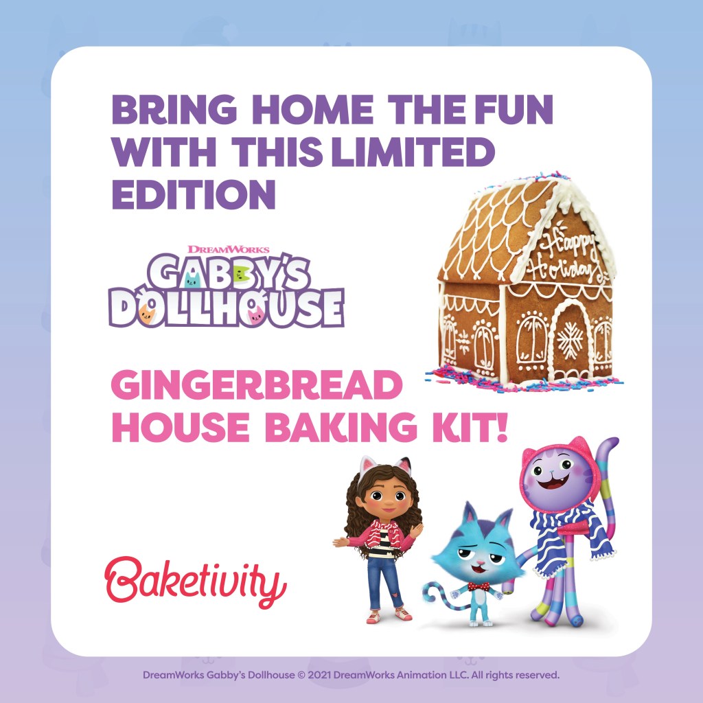FAMILYFINDSMN GIVEAWAY -DreamWorks Animation’s Gabby’s Dollhouse and Baketivity are teaming up so you can design your own cat-tastic gingerbread house with Gabby and the Gabby cats! Use the link below to enter for a chance to win or visit baketivity.com to order your Gabby’s Dollhouse Limited Edition Baking Kit which includes step by step instructions and all the dry ingredients you’ll need to create your own Gabby’s gingerbread house!